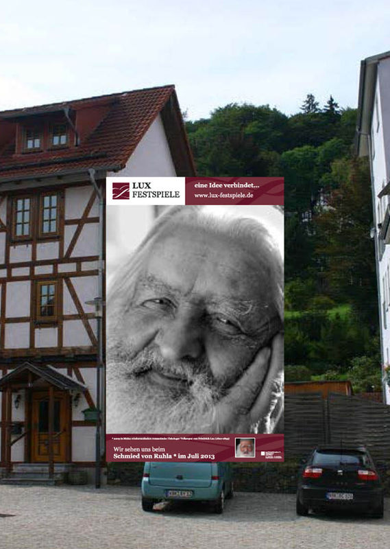 Mit finanzieller Unterstützung durch die RAG Wartburgregion, Finanzmittel der Stadt Ruhla und des Lux Festspielvereins e.V., konnten verschiedene Marketingartikel zur Unterstützung und Verbreitung der Lux Festspielidee in der Region entworfen und angeschafft werden. Neben verschiedenen Werbebannern, 1 Roll up und 1 Werbeballon, wurden 3 Plakataufsteller (3x2m) angeschafft, die an 3 markanten Stellen in der Region aufgestellt werden sollen. Damit erhofft sich der Lux Festspielverein e.V. eine bessere Wahrnehmung / Bewerbung der einzelnen Kulturveranstaltungen in der Region. Die Aufstellung einer 5x8m großen temporären Werbeplane mit der Bewerbung der Opernaufführung 2013, in einer Baulücke in Ruhla, war ebenfalls vorgesehen.