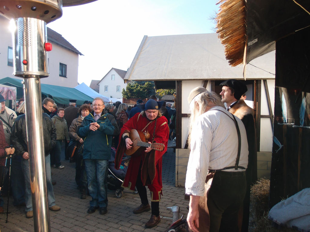 Zur Freude der Marktbesucher bot Kaschtin hammerschlagend mit dem Spielmann Thomasius den musikalischen Rahmen für Martin Luthers Marktpredigten.
