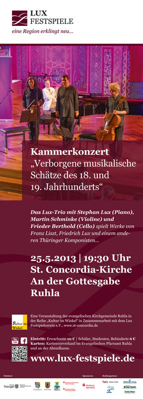 Herzliche Einladung! Wir freuen uns auf das Konzert mit unserem Lux Trio am Samstag den 25.05.2013, 19:30 Uhr in der St. Concordia Kirche Ruhla! Das sollten Sie nicht verpassen!