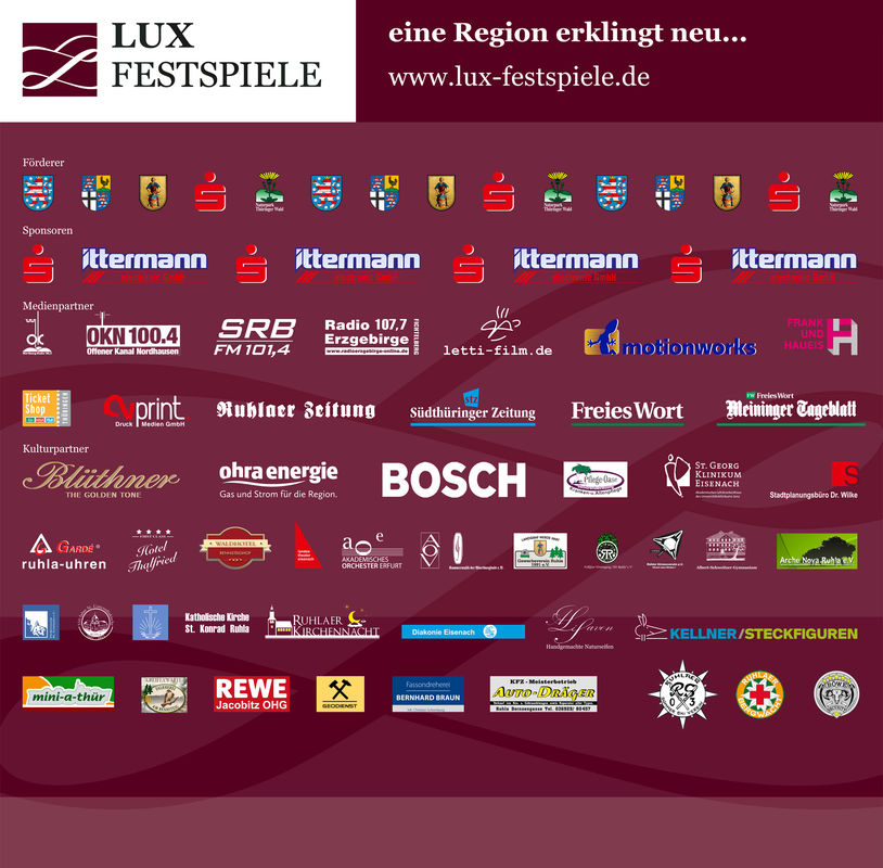Wie Sie sehen ist unsere Sponsorenwand doch recht bunt und abwechslungsreich geworden. Wir möchten uns schon heute einmal auf diesem Wege bei allen Sponsoren, Förderern und Kulturpartnern der Lux Festspiele 2013 vom 15.07.2013 - 21.07.2013 in Ruhla recht herzlich für Ihre wichtige Unterstützung bedanken!