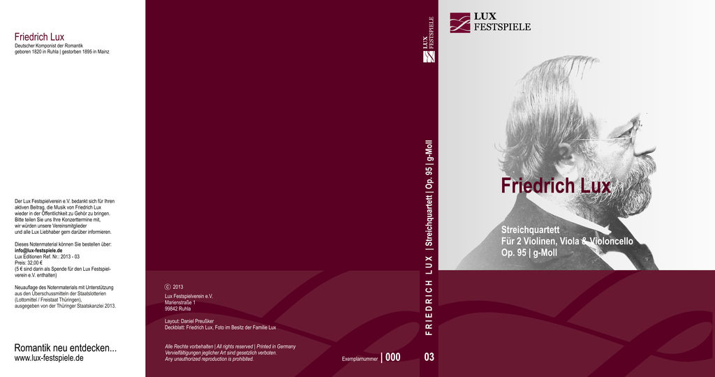 Das Notenmaterial der 3 Streichquartette von Friedrich Lux wurden durch den Lux Festspielverein e.V. neu aufgelegt und kann nun über den Lux Festspielverein bestellt werden.